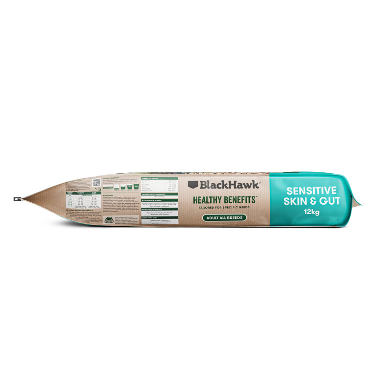 Black Hawk Healthy Benefits Sensitive Skin & Gut offers a balanced diet and has been specifically developed by our animal nutritionists and vets to aid nutrient absorption, support bowel function, and assist with skin and coat health in adult dogs. Highly digestible, it is fortified with probiotics and prebiotics for optimal gut flora. It also contains fish oil, a natural source of omega-3 fatty acids for healthy skin, shiny coat, and joint support.