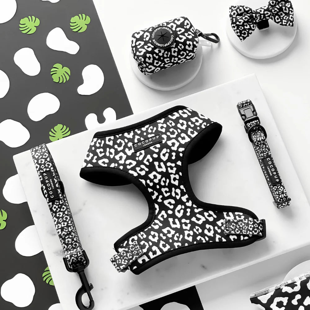 Take a walk on the wild side with the Cocopup London Black Leopard Adjustable Neck Harness. Featuring a classic monochrome print, this stylish harness is perfect for a fashionable dog walk. Keep your pup safe and looking fierce!