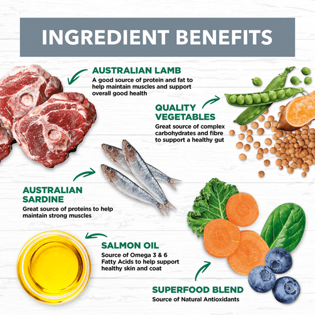 Australian meat is our #1 Ingredient to deliver quality protein for lean muscle maintenance. We also use carefully selected vegetables to provide sources of grain free complex carbohydrates and fibre to help support a healthy gut. A natural superfood blend (including Tomato, Apple, Carrot, Pumpkin, Kale, Blueberries, Spinach & Cranberries) is added as a source of antioxidants, as well as Omega 3 & 6 to help support healthy skin & coat. A natural pre-biotic is also included to support healthy digestion, and essential vitamins and minerals ensure your best mate is provided with their complete daily nutrition.
