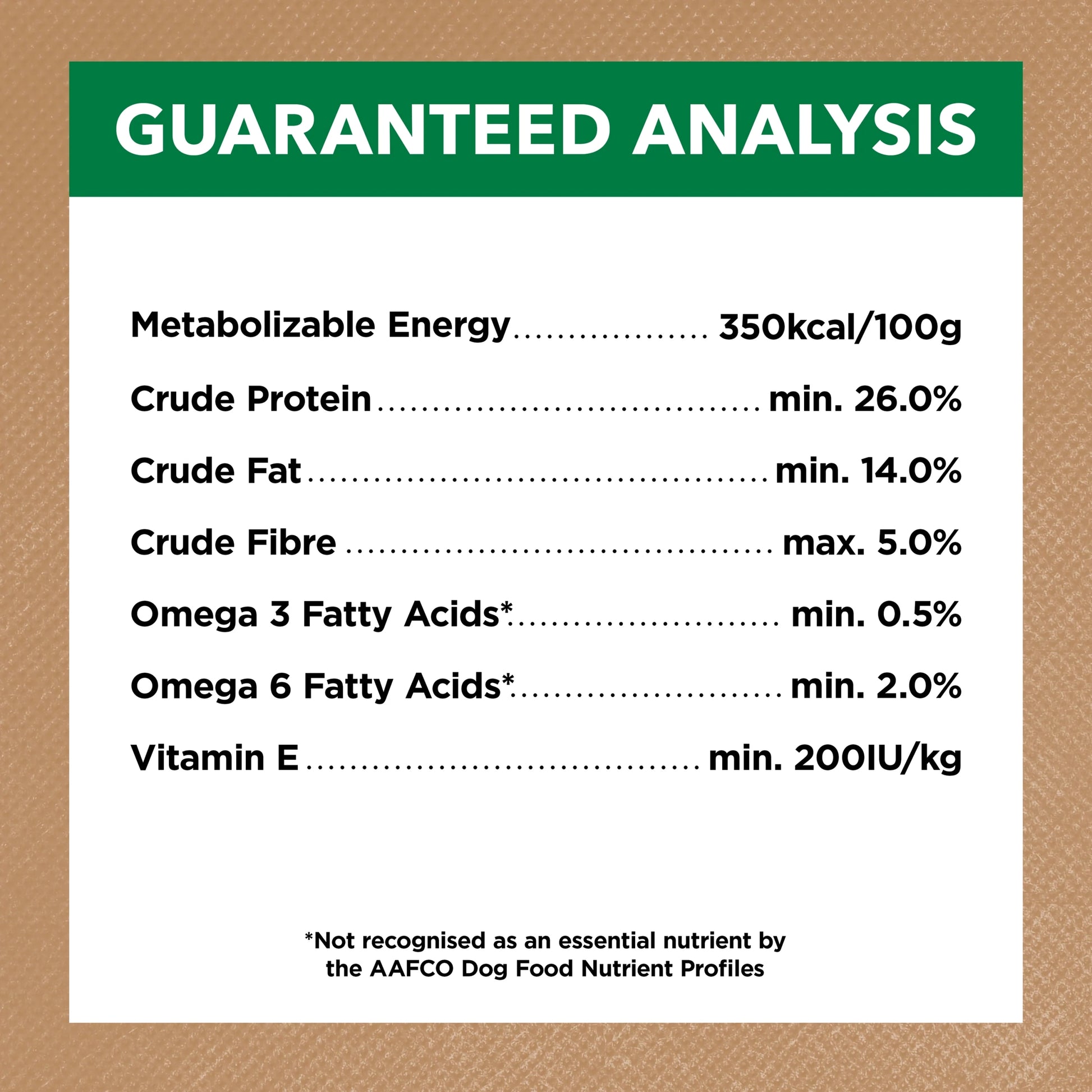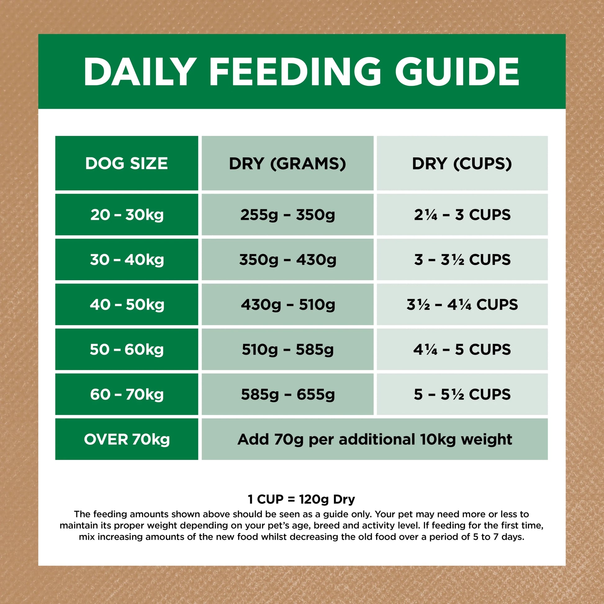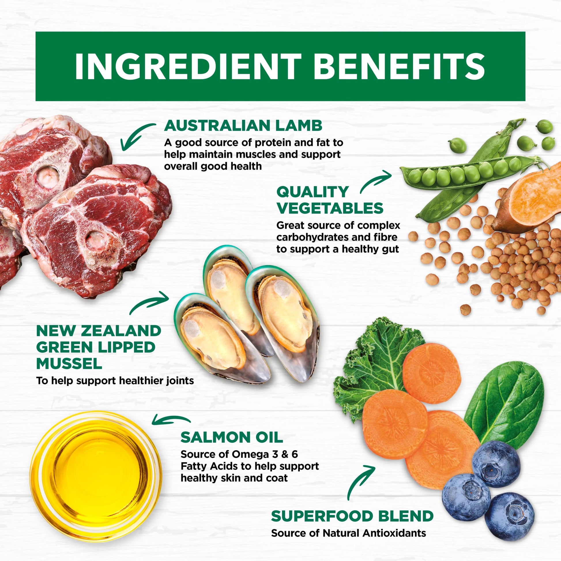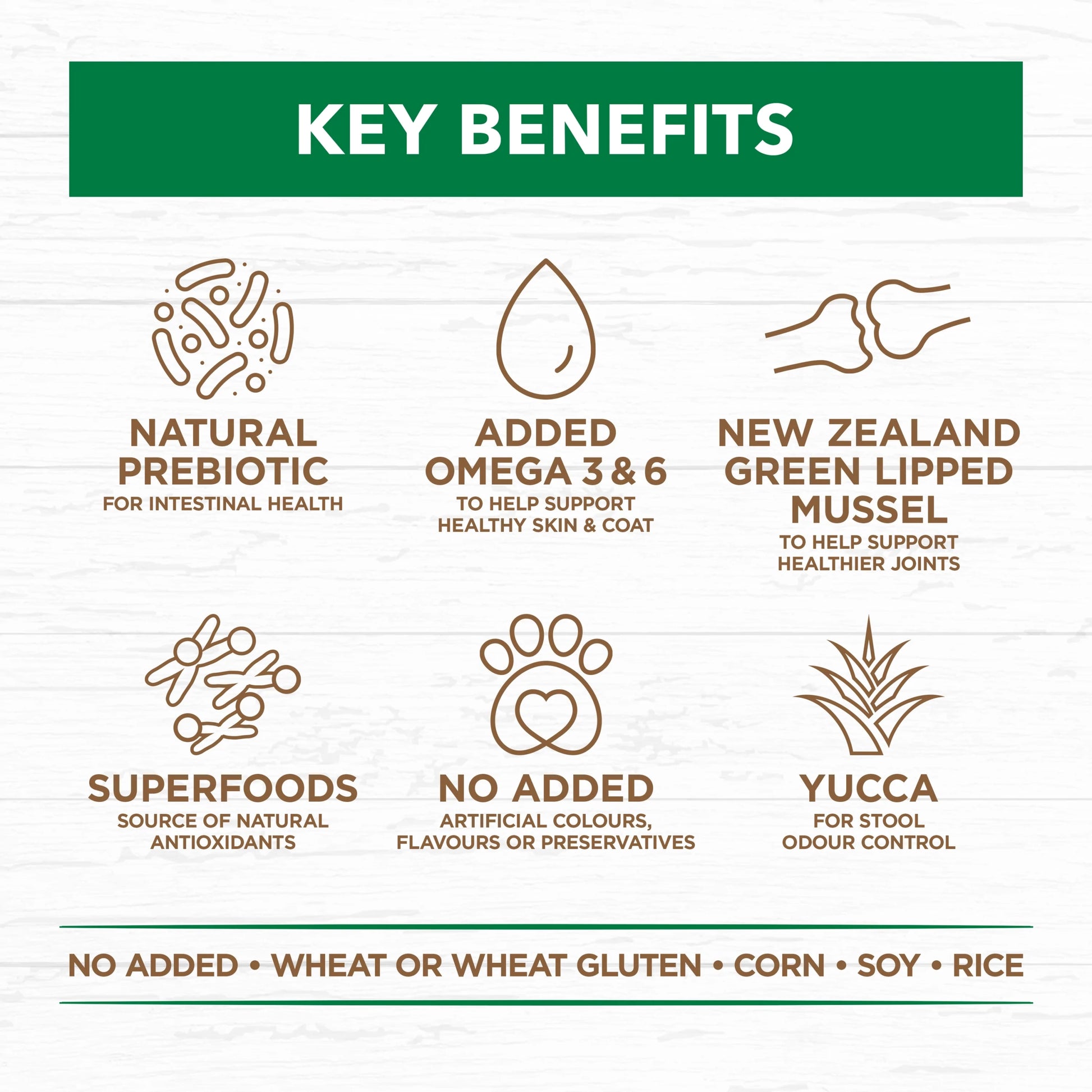 Our large breed formula has larger kibbles to encourage the dog to eat more slowly, which may help limit the ingestion of air and limit the fast consumption of food to help digestion. As dogs get older they are less efficient in metabolising dietary protein. This is why we have optimised protein levels in our large breed adult formulas to provide an increased protein quality and quantity to support several factors common with ageing such as a reduced muscle mass, reduced efficiency of metabolism profiles. To further assist we have added New Zealand Green Lipped Mussels to help support healthy joints.