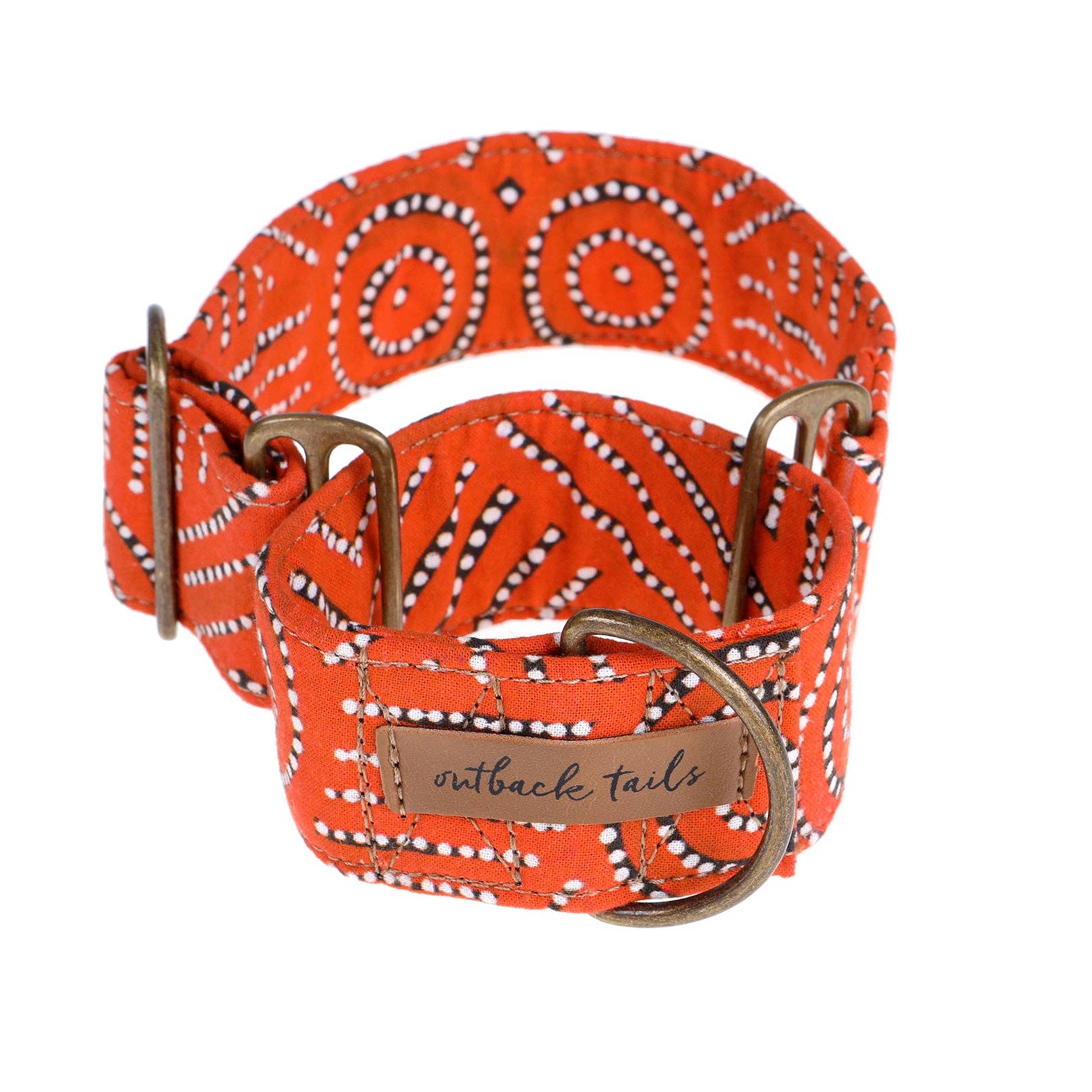 Featuring the artwork 'Water Dreaming' by Reanne Nampijinpa Brown from Warlukurlangu Artists. 10% of sales goes back to Reanne. Designed for greyhound and sighthound breeds, these martingale collars help control your dog on a walk without causing stress on their delicate necks. Our collars are made from cotton canvas that has been wrapped around nylon webbing and come in 4 sizes. Please measure up your dogs neck to ensure you choose the right size for your dog: Sizing (please measure your dog's neck to choose the right size) Medium - 36cm to 42cm (4cm wide) - Larger Whippets Large - 38cm to 46cm (4cm wide) Smaller and Regular Greyhounds Watch our demo video here to fit your dog