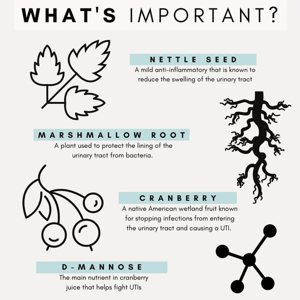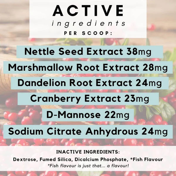 ACTIVE: Nettle Seed Extract 38mg, Marshmallow Root Extract 28mg, Dandelion Root Extract 24mg, Cranberry Extract 23mg, D-Mannose 22mg, Sodium Citrate Anhydrous 24mg. Inactive: Dextrose, Fumed Silica, Dicalcium Phosphate, Fish Flavour*.